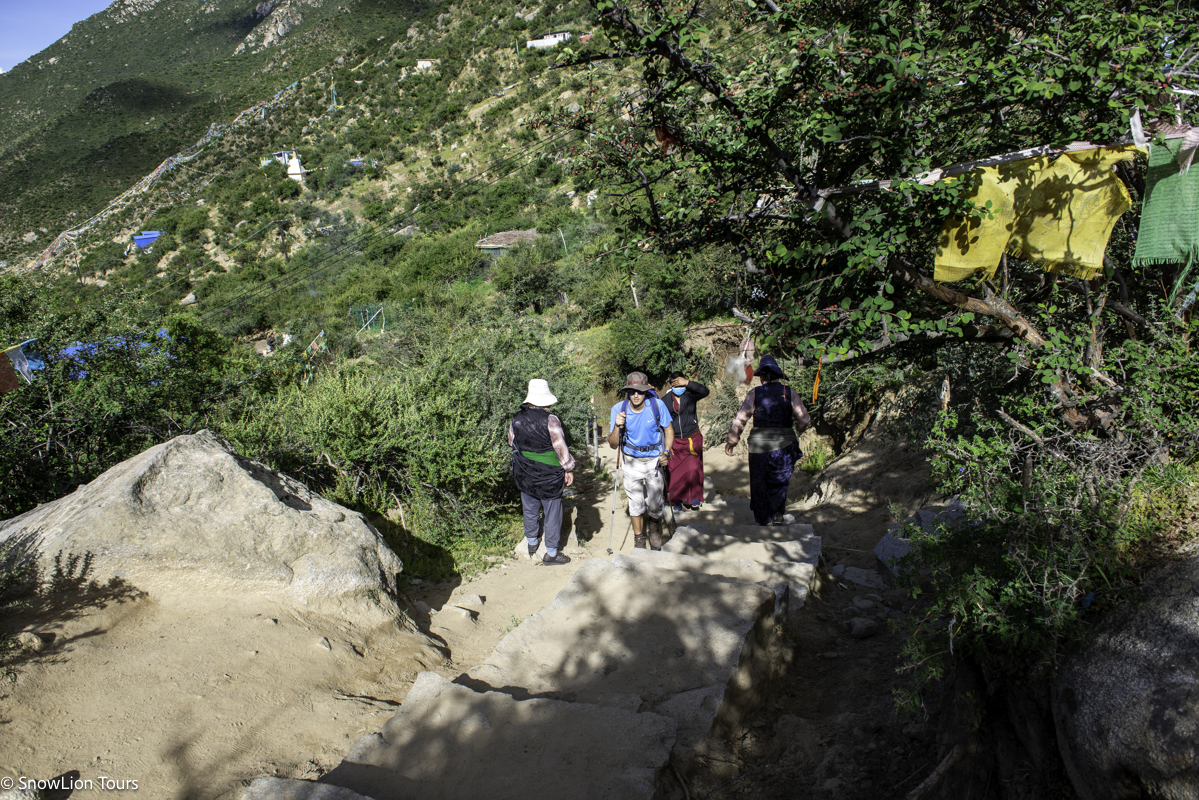 The hiking route allows visitors to gradually transition from the institutional environment of Samye Monastery to the wild, contemplative atmosphere of the mountain hermitage, creating a natural progression from formal religious architecture to the raw spiritual power of cave meditation sites.