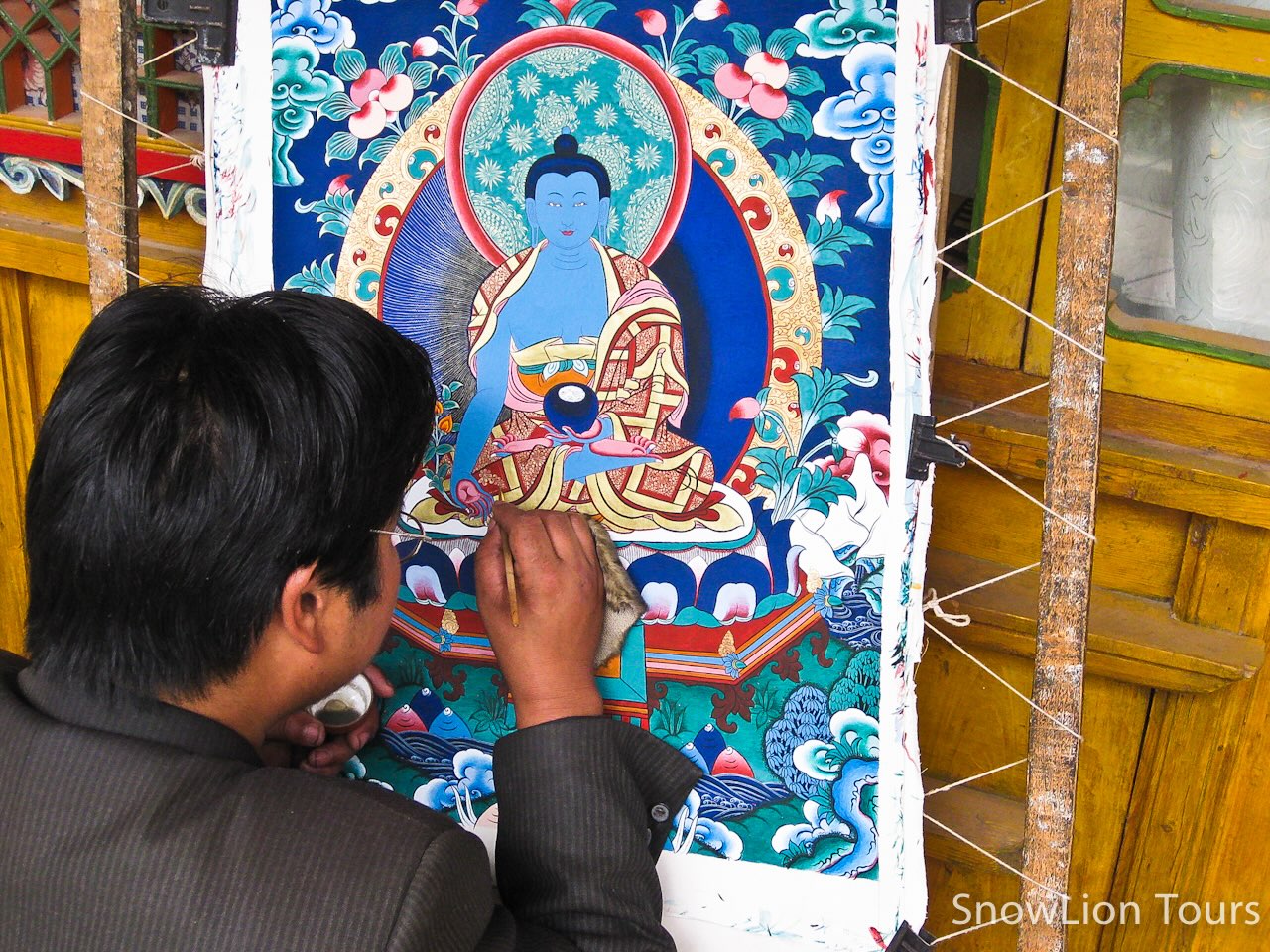 One Tibetan artist is painting traditional Thangka painting.